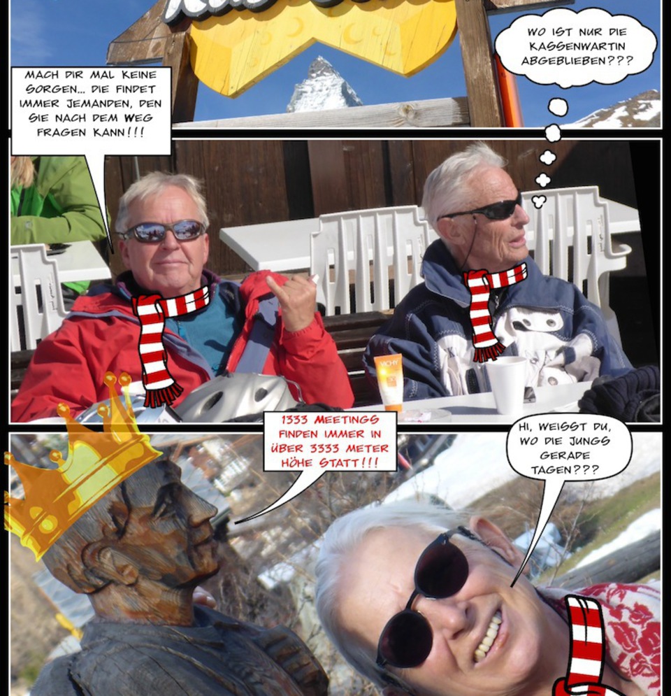 Wir sind ein schwarz-roter Haufen, wir tragen eine schwarz-rote Clubjacke (Preis: 133,33 Dollar), wir jagen nur Berge ab 3333 Höhenmeter runter, wir trinken und essen nie unterhalb 3333 Höhenmeter und hören Jazzstandards auf der Gandegg-Hütte auf 3030 Höhenmeter.